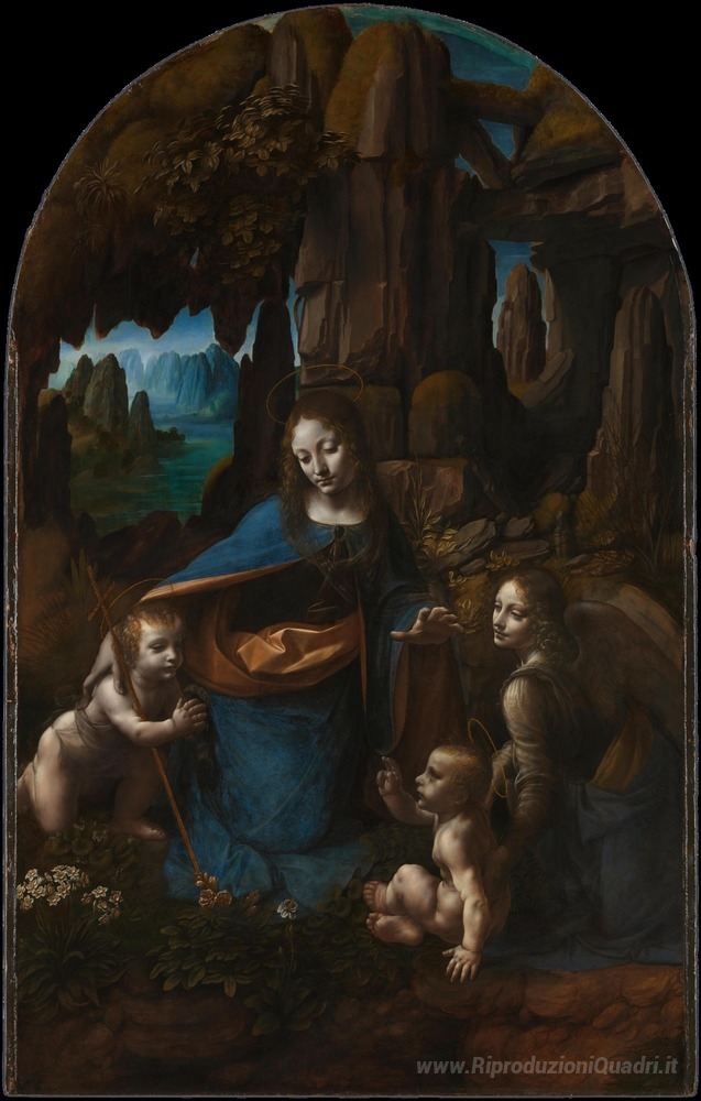 Ti offriamo una riproduzione artigianale su tela dell'opera famosa 'La Vergine delle Rocce' di Leonardo da Vinci, dal Museo delle Riproduzioni.
