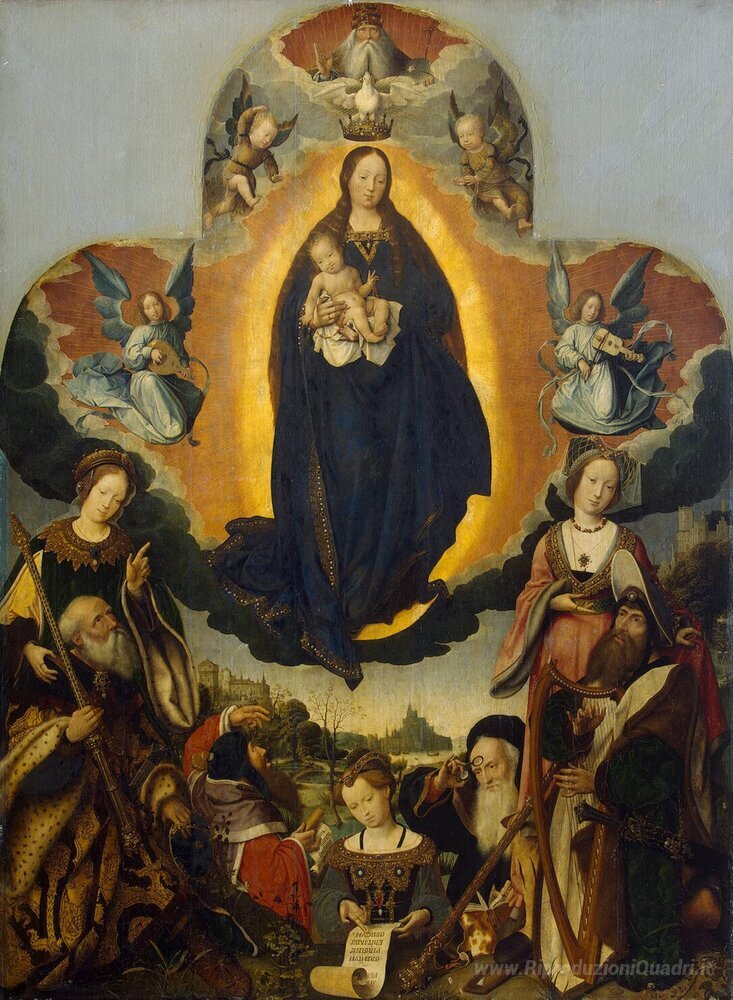 Ti offriamo una riproduzione artigianale su tela dell'opera famosa 'La Vergine Maria in Gloria' di Jan Provoost, dal Museo delle Riproduzioni.