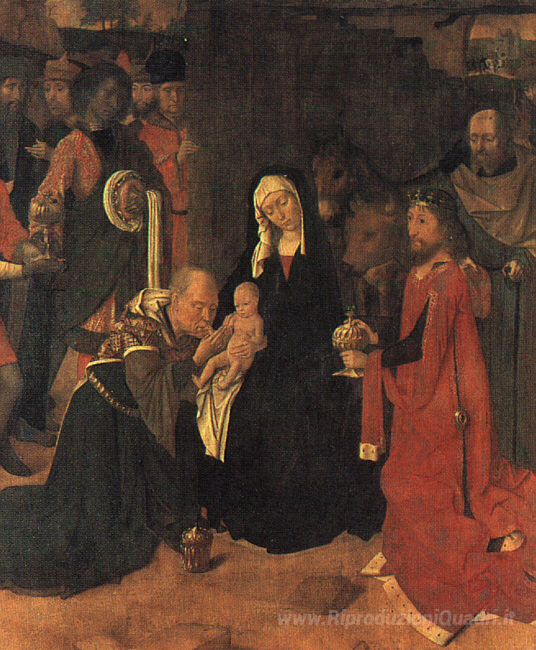 Ti offriamo una riproduzione artigianale su tela dell'opera famosa 'L'Adorazione dei Magi' di Gerard David, dal Museo delle Riproduzioni.