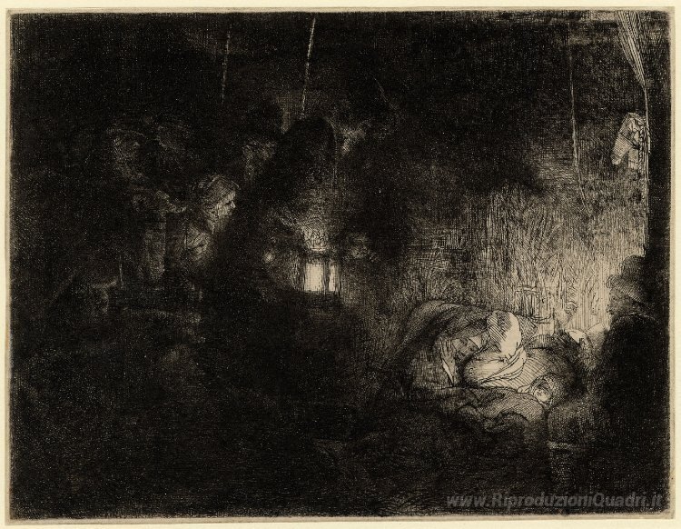 Ti offriamo una riproduzione artigianale su tela dell'opera famosa 'L'adorazione dei pastori di' di Rembrandt, dal Museo delle Riproduzioni.