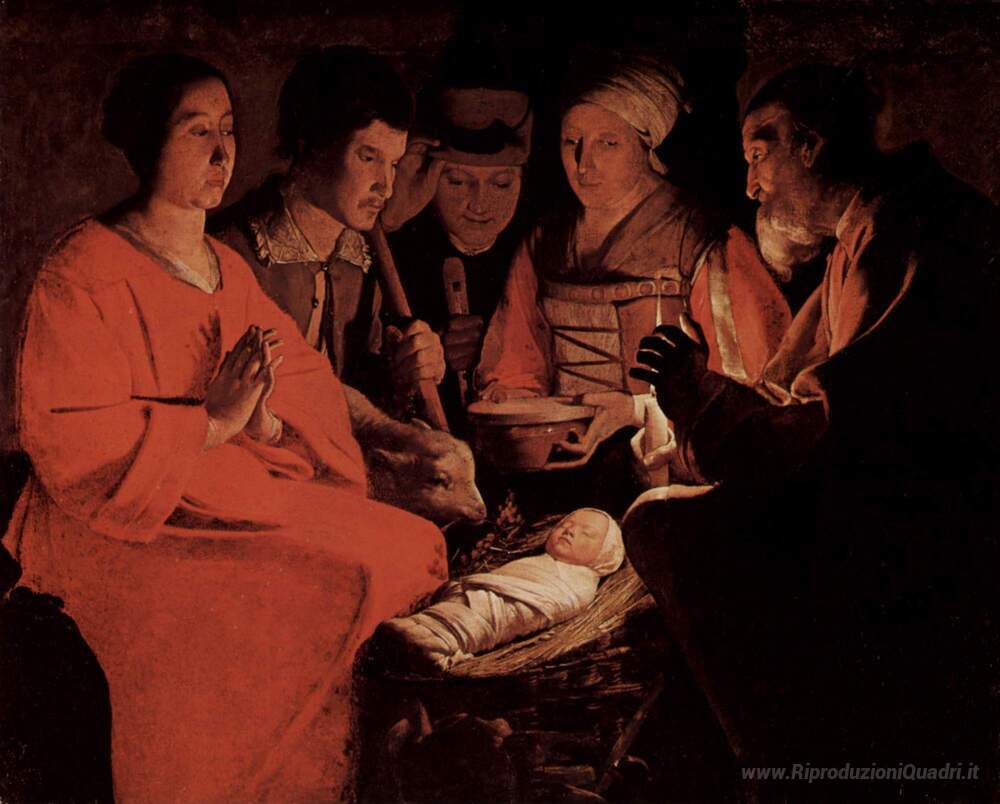 Ti offriamo una riproduzione artigianale su tela dell'opera famosa 'L'Adorazione dei pastori' di Georges de la Tour, dal Museo delle Riproduzioni.