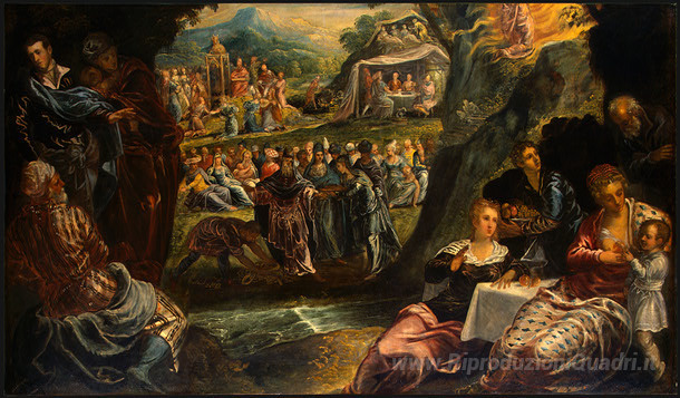 Ti offriamo una riproduzione artigianale su tela dell'opera famosa 'L'Adorazione del vitello d'oro' di Tintoretto, dal Museo delle Riproduzioni.