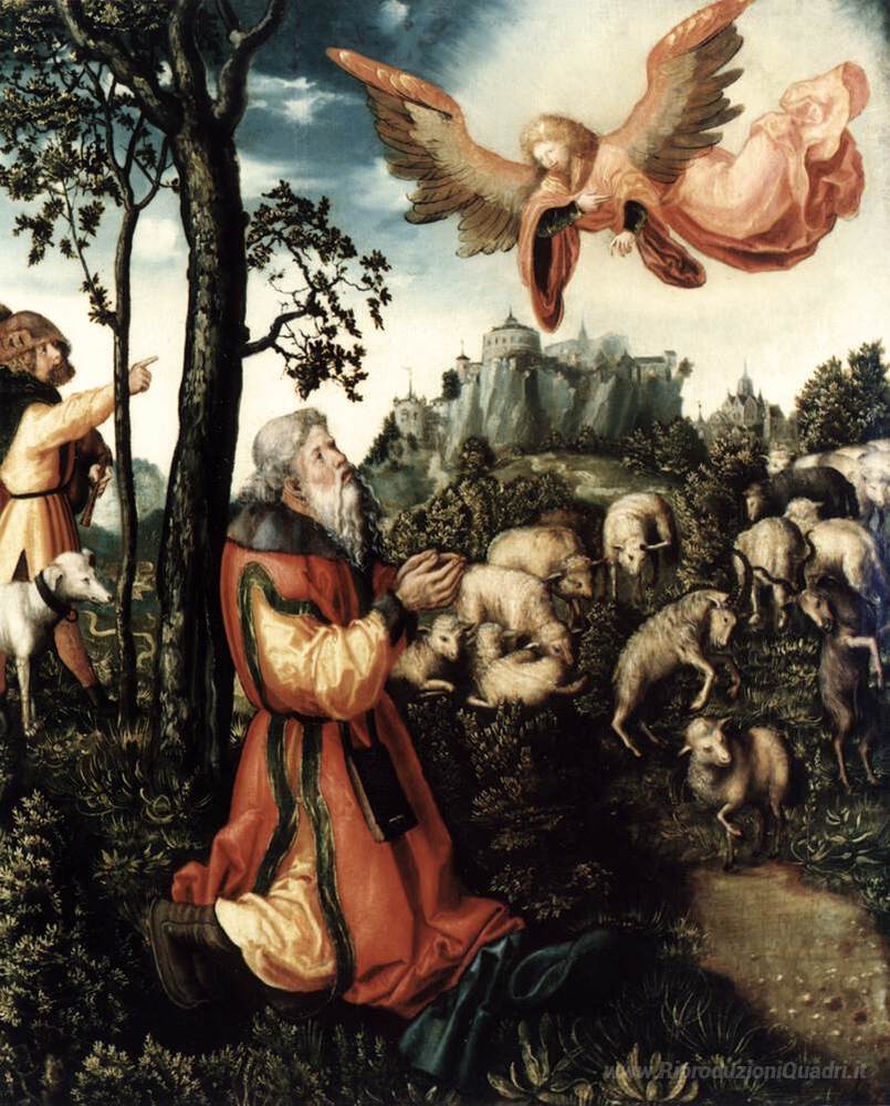 Ti offriamo una riproduzione artigianale su tela dell'opera famosa 'L'Annunciazione di Joachim' di Lucas Cranach the Elder, dal Museo delle Riproduzioni.
