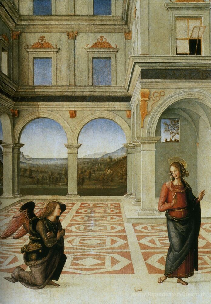 Ti offriamo una riproduzione artigianale su tela dell'opera famosa 'L'Annunciazione' di Pietro Perugino, dal Museo delle Riproduzioni.