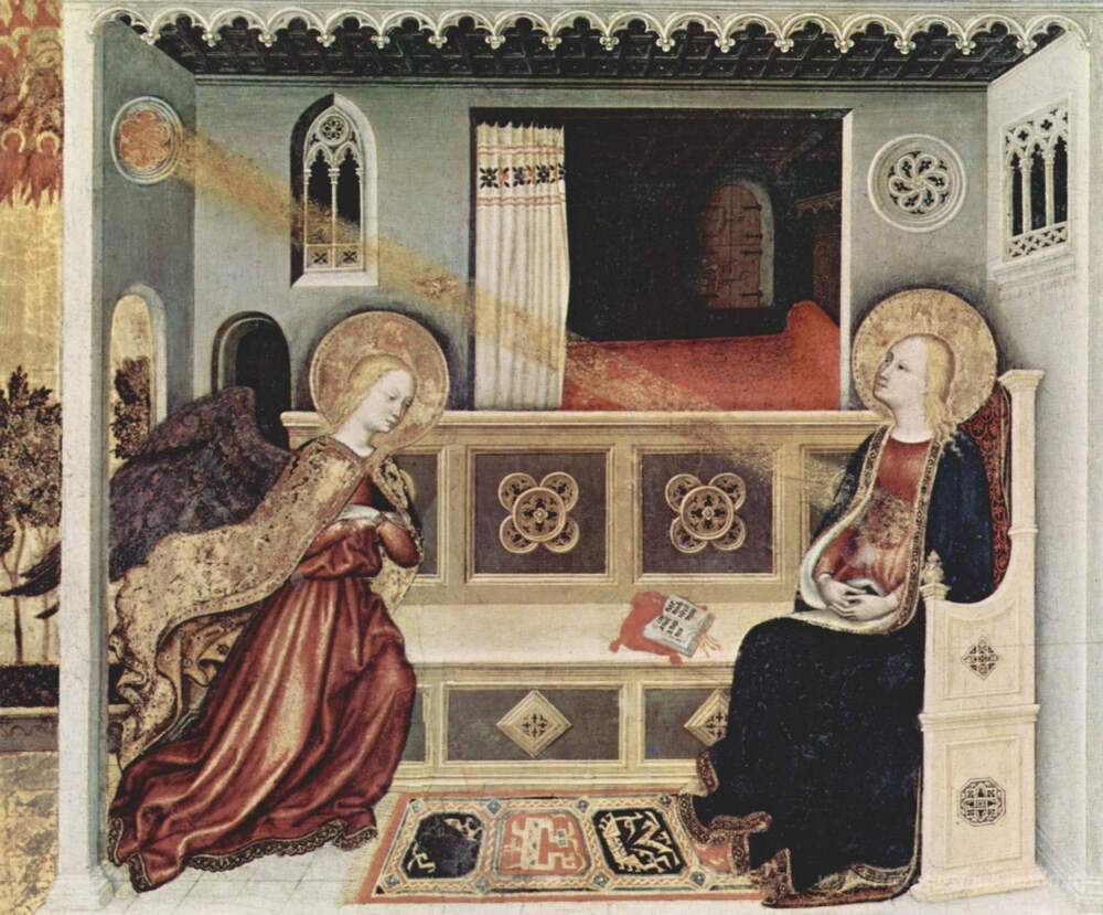 Ti offriamo una riproduzione artigianale su tela dell'opera famosa 'L'Annunciazione' di Gentile da Fabriano, dal Museo delle Riproduzioni.