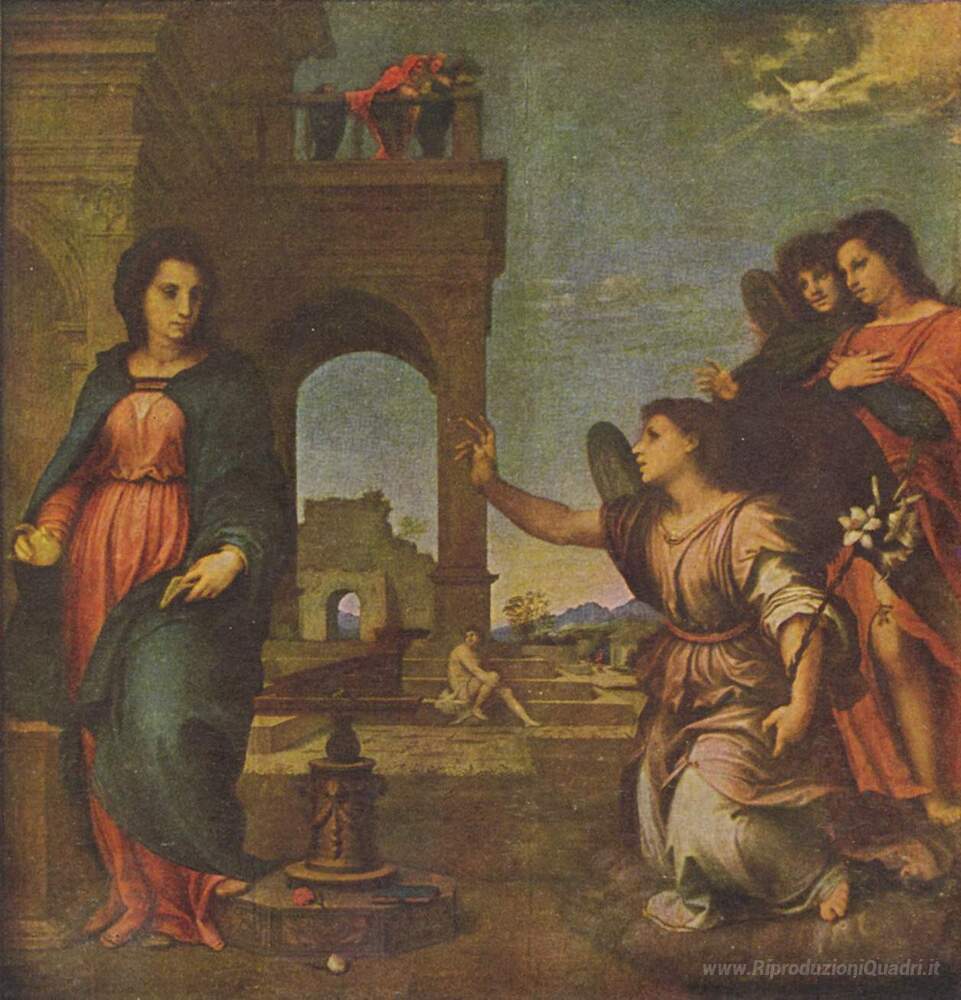 Ti offriamo una riproduzione artigianale su tela dell'opera famosa 'L'Annunciazione' di Andrea del Sarto, dal Museo delle Riproduzioni.