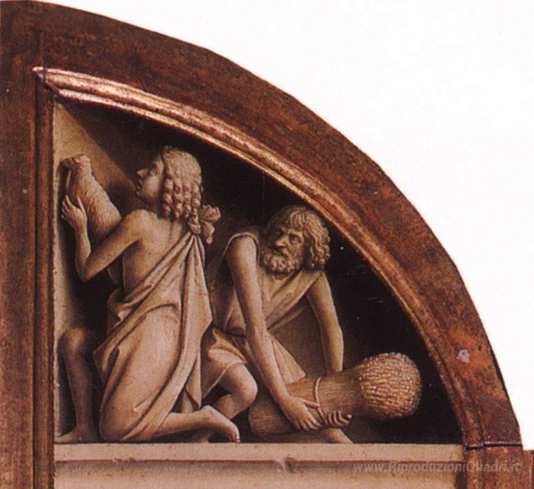 Ti offriamo una riproduzione artigianale su tela dell'opera famosa 'Le offerte di Caino e Abele' di Jan van Eyck, dal Museo delle Riproduzioni.