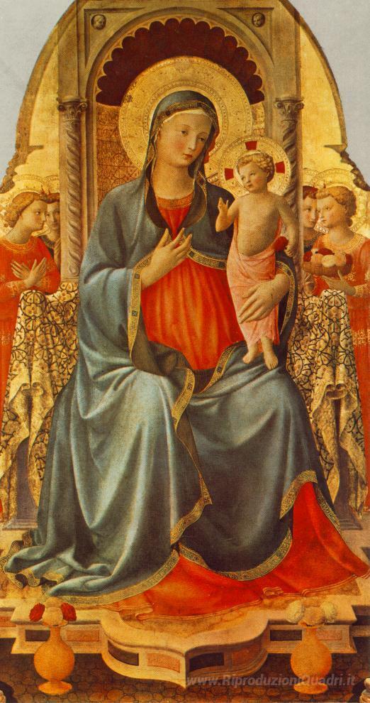 Ti offriamo una riproduzione artigianale su tela dell'opera famosa 'Madonna col Bambino e Angeli' di Fra Angelico, dal Museo delle Riproduzioni.