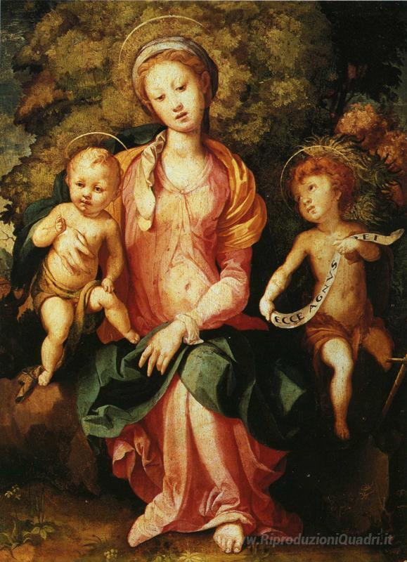Ti offriamo una riproduzione artigianale su tela dell'opera famosa 'Madonna col Bambino e San Giovannino' di Jacopo Pontormo, dal Museo delle Riproduzioni.