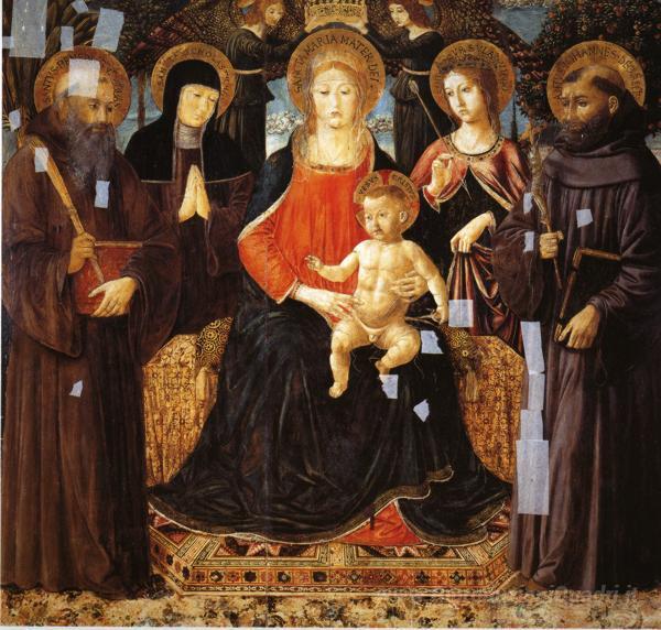 Ti offriamo una riproduzione artigianale su tela dell'opera famosa 'Madonna col Bambino in trono tra San Benedetto, Santa Scolastica' di Benozzo Gozzoli, dal Museo delle Riproduzioni.