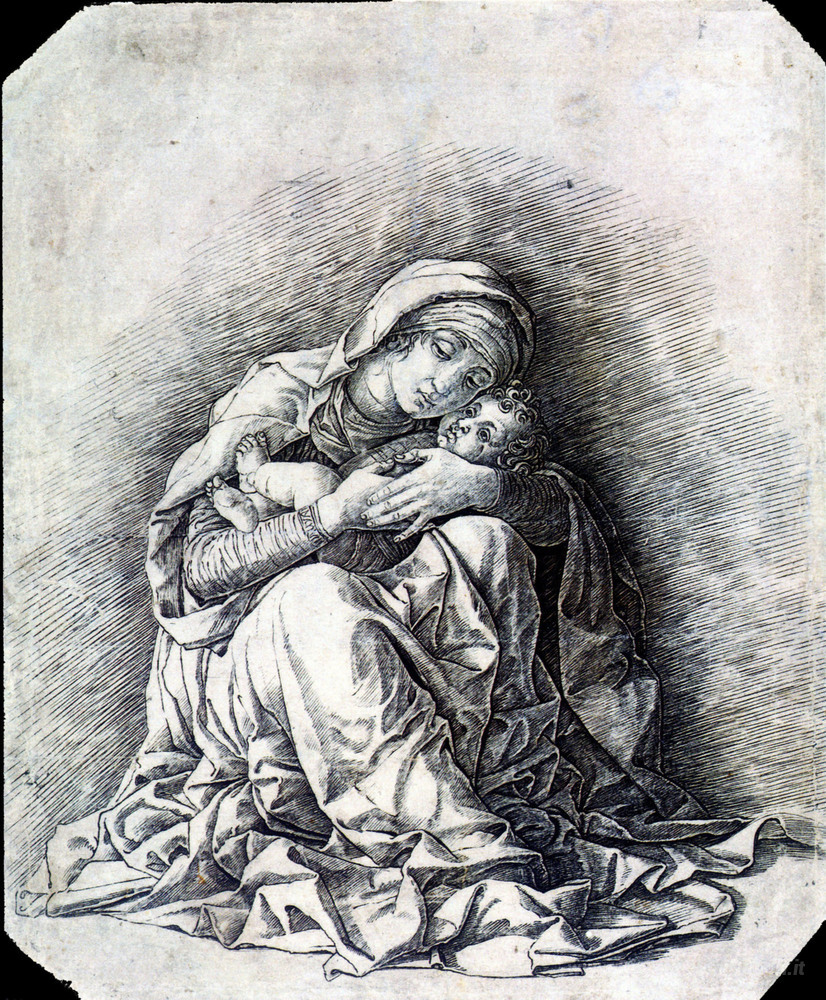 Scopri la magnificenza del dipinto a olio Madonna col Bambino (Madonna dell’Umiltà), una delle opere più celebri di Andrea Mantegna, maestro del Rinascimento italiano. Questa straordinaria rappresentazione non solo incarna la maestria tecnica dell'artista, ma riflette anche la sua profonda comprensione della spiritualità e della sacralità. Mantegna utilizza un delicato gioco di luci e ombre, creando un senso di profondità che incanta l'osservatore e lo trasporta in un'atmosfera di contemplazione.