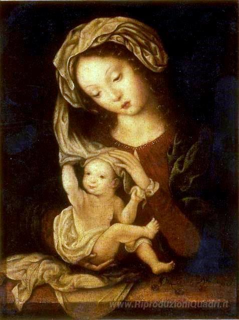 Ti offriamo una riproduzione artigianale su tela dell'opera famosa 'Madonna con Bambino e ciliegie' di Mabuse, dal Museo delle Riproduzioni.