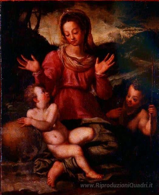 Ti offriamo una riproduzione artigianale su tela dell'opera famosa 'Madonna con Bambino e San Giovanni Battista' di Andrea del Sarto, dal Museo delle Riproduzioni.