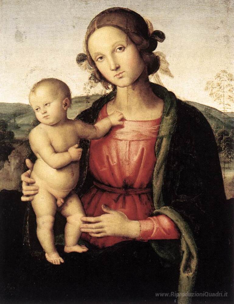 Ti offriamo una riproduzione artigianale su tela dell'opera famosa 'Madonna con Bambino' di Pietro Perugino, dal Museo delle Riproduzioni.