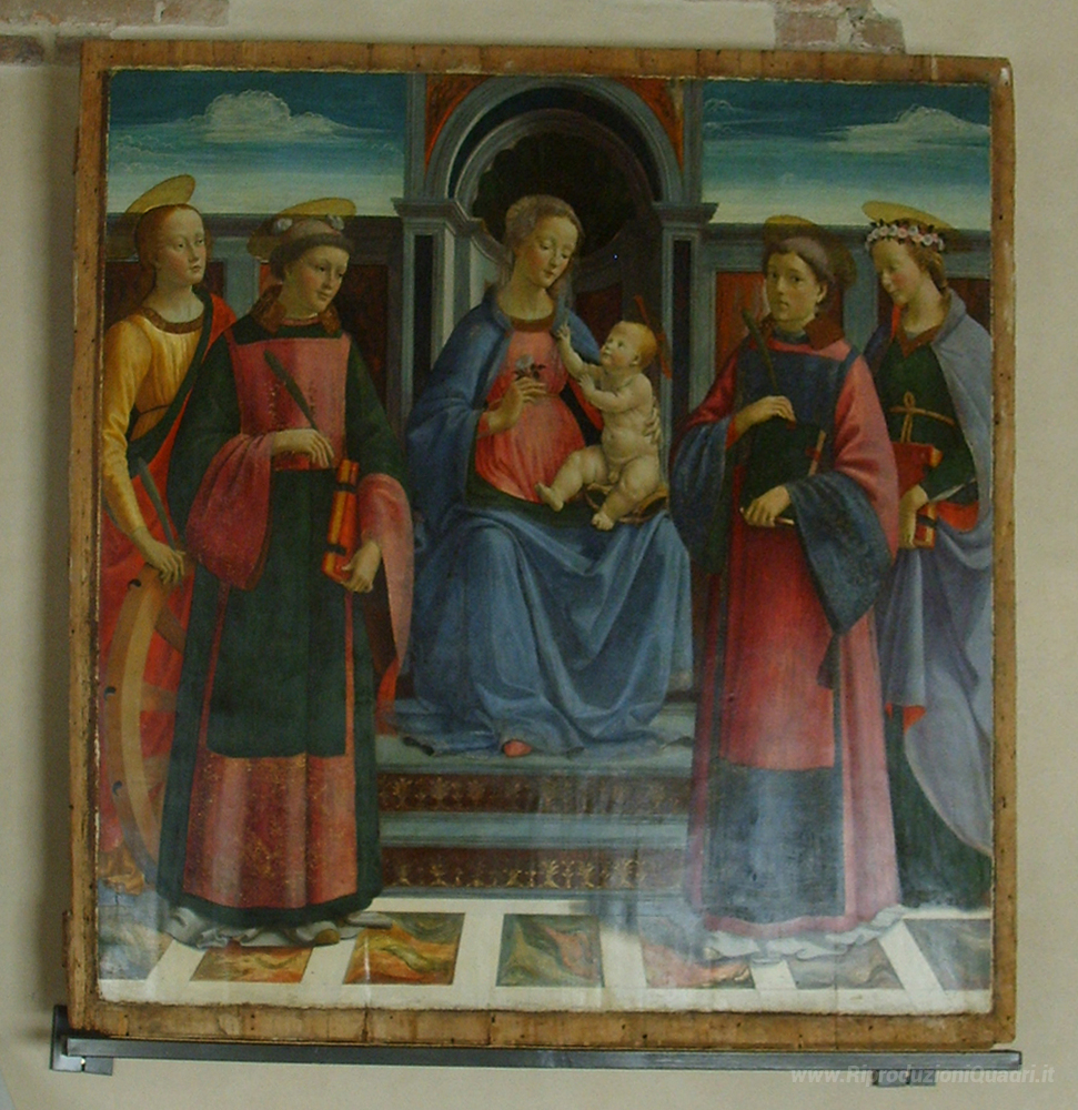 Ti offriamo una riproduzione artigianale su tela dell'opera famosa 'Madonna con Bambino' di Domenico Ghirlandaio, dal Museo delle Riproduzioni.