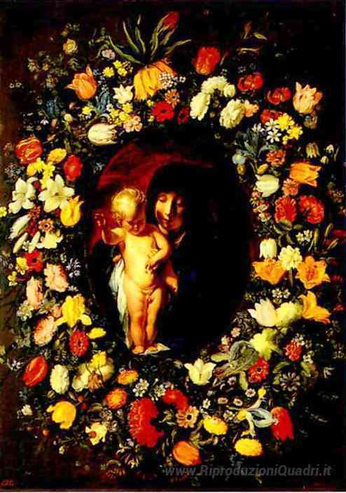 Ti offriamo una riproduzione artigianale su tela dell'opera famosa 'Madonna con il Bambino avvolto con fiori' di Jacob Jordaens, dal Museo delle Riproduzioni.