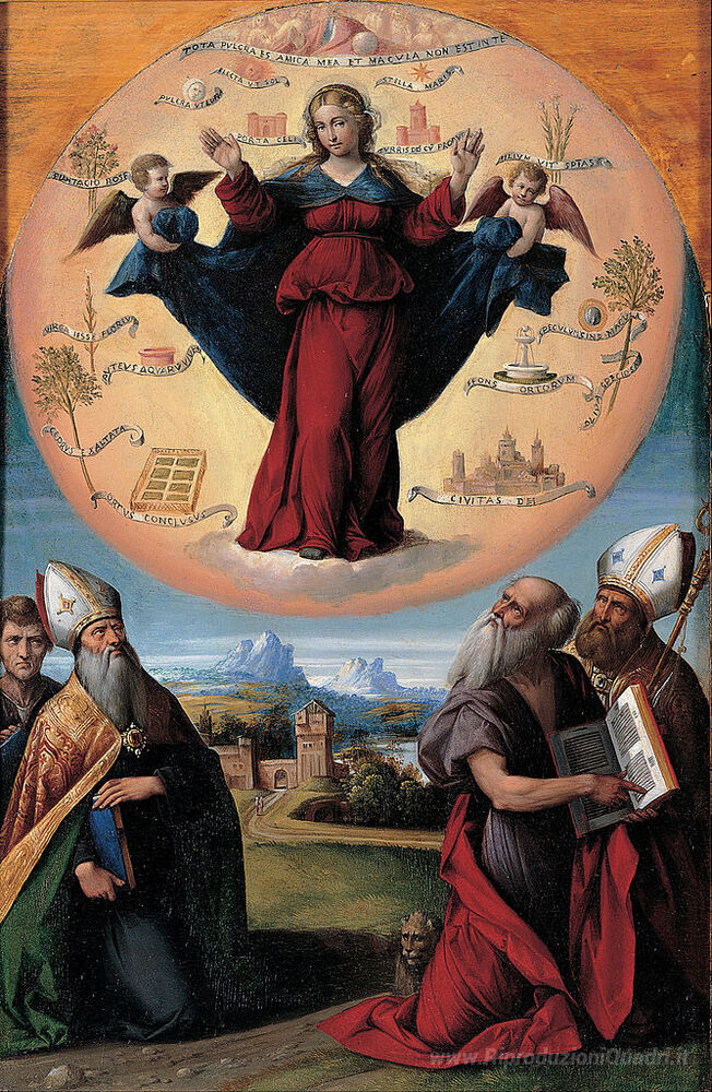 Ti offriamo una riproduzione artigianale su tela dell'opera famosa 'Madonna in Gloria e Santi Hones' di Benvenuto Tisi, dal Museo delle Riproduzioni.