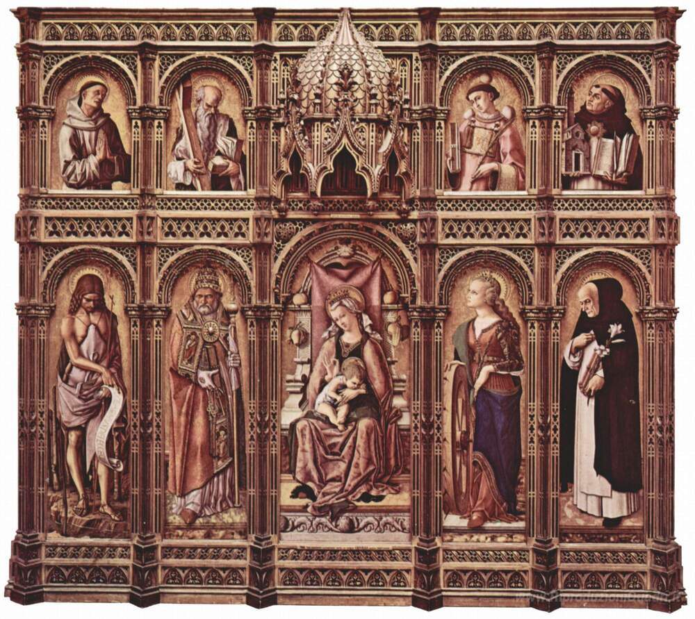 Ti offriamo una riproduzione artigianale su tela dell'opera famosa 'Madonna in trono' di Carlo Crivelli, dal Museo delle Riproduzioni.