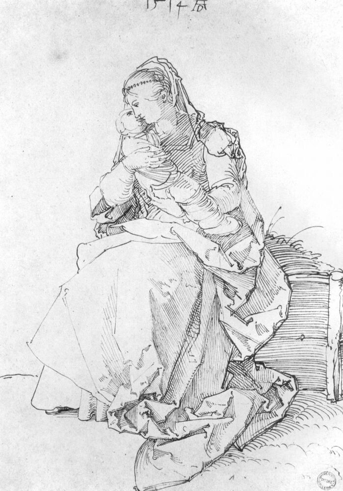 Ti offriamo una riproduzione artigianale su tela dell'opera famosa 'Maria con il bambino avvolto sulla riva erbosa' di Albrecht Durer, dal Museo delle Riproduzioni.