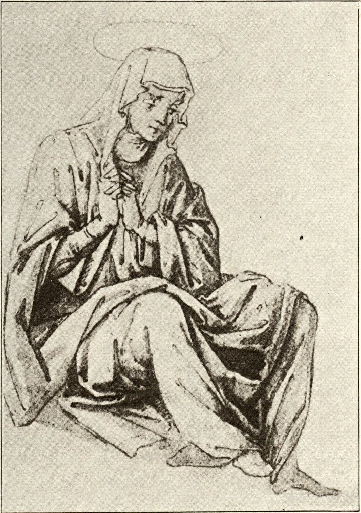 Ti offriamo una riproduzione artigianale su tela dell'opera famosa 'Maria seduta sotto la Croce' di Andrea del Castagno, dal Museo delle Riproduzioni.
