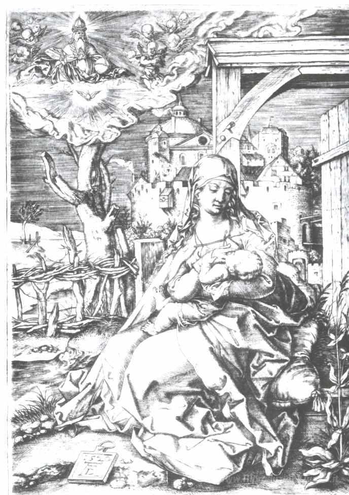 Ti offriamo una riproduzione artigianale su tela dell'opera famosa 'Mary al cancello' di Albrecht Durer, dal Museo delle Riproduzioni.