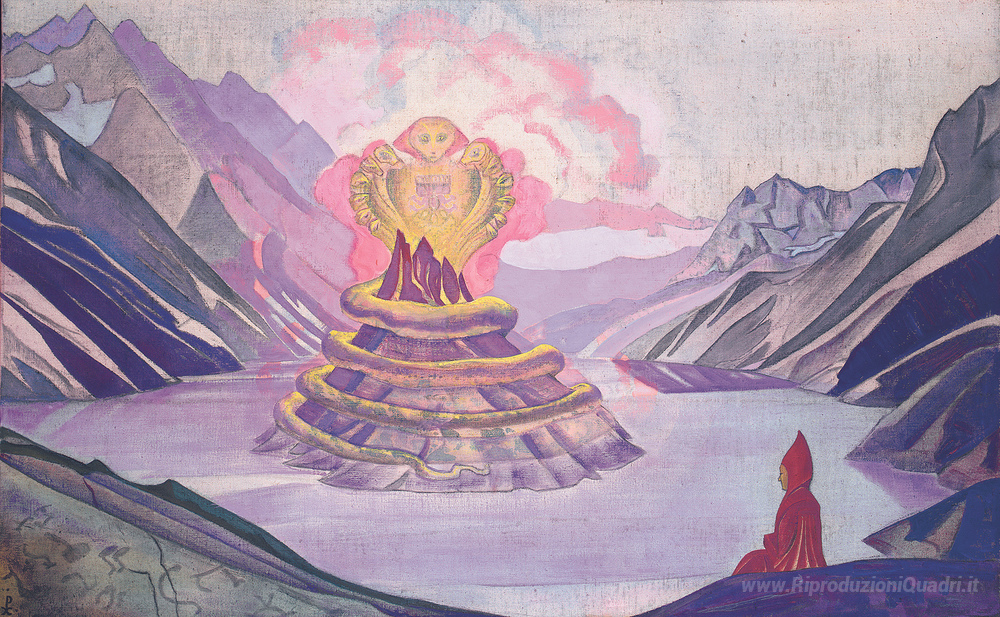 Ti offriamo una riproduzione artigianale su tela dell'opera famosa 'Nagarjuna, conquistatore del Serpente' di Nicholas Roerich, dal Museo delle Riproduzioni.