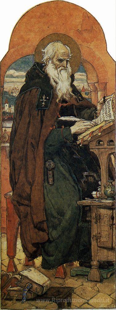Ti offriamo una riproduzione artigianale su tela dell'opera famosa 'Nestor il Cronista' di Viktor Vasnetsov, dal Museo delle Riproduzioni.