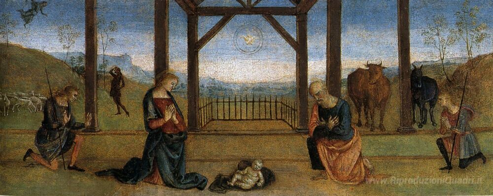Ti offriamo una riproduzione artigianale su tela dell'opera famosa 'Pala di Corciano (Natività)' di Pietro Perugino, dal Museo delle Riproduzioni.