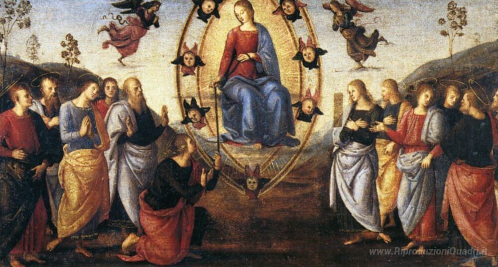 Ti offriamo una riproduzione artigianale su tela dell'opera famosa 'Pala di Fano (Assunzione)' di Pietro Perugino, dal Museo delle Riproduzioni.
