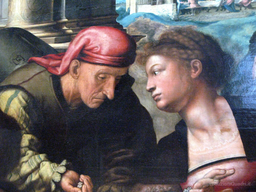 Ti offriamo una riproduzione artigianale su tela dell'opera famosa 'Parabola del Figliol Prodigo (particolare)' di Jan van Hemessen, dal Museo delle Riproduzioni.