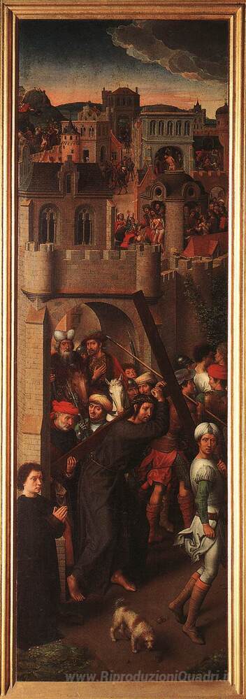 Ti offriamo una riproduzione artigianale su tela dell'opera famosa 'Passion (Greverade) Pala (di sinistra)' di Hans Memling, dal Museo delle Riproduzioni.