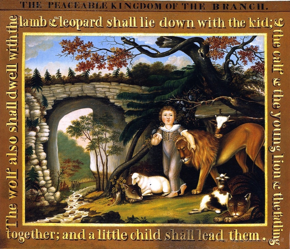 Ti offriamo una riproduzione artigianale su tela dell'opera famosa 'Peaceable Kingdom' di Edward Hicks, dal Museo delle Riproduzioni.