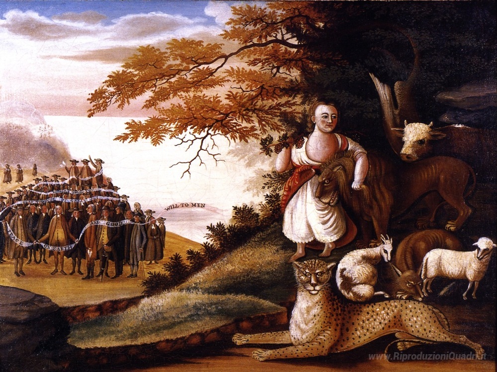 Ti offriamo una riproduzione artigianale su tela dell'opera famosa 'Peaceable Kingdom' di Edward Hicks, dal Museo delle Riproduzioni.