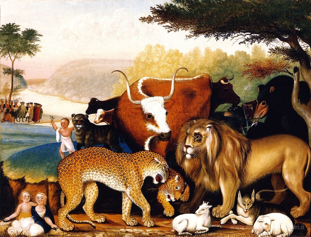 Ti offriamo una riproduzione artigianale su tela dell'opera famosa 'Peaceable Kingdom' di Edward Hicks, dal Museo delle Riproduzioni.