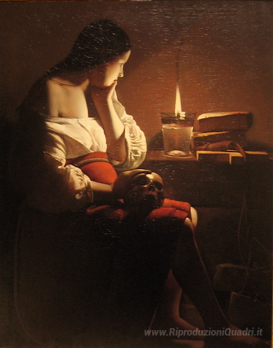 Ti offriamo una riproduzione artigianale su tela dell'opera famosa 'Pentirsi Maddalena, chiamato anche Maddalena in una luce tremola' di Georges de la Tour, dal Museo delle Riproduzioni.