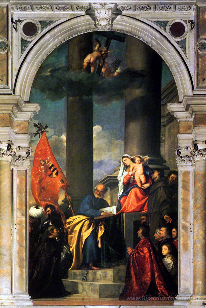 Ti offriamo una riproduzione artigianale su tela dell'opera famosa 'Pesaros Madonna' di Titian, dal Museo delle Riproduzioni.