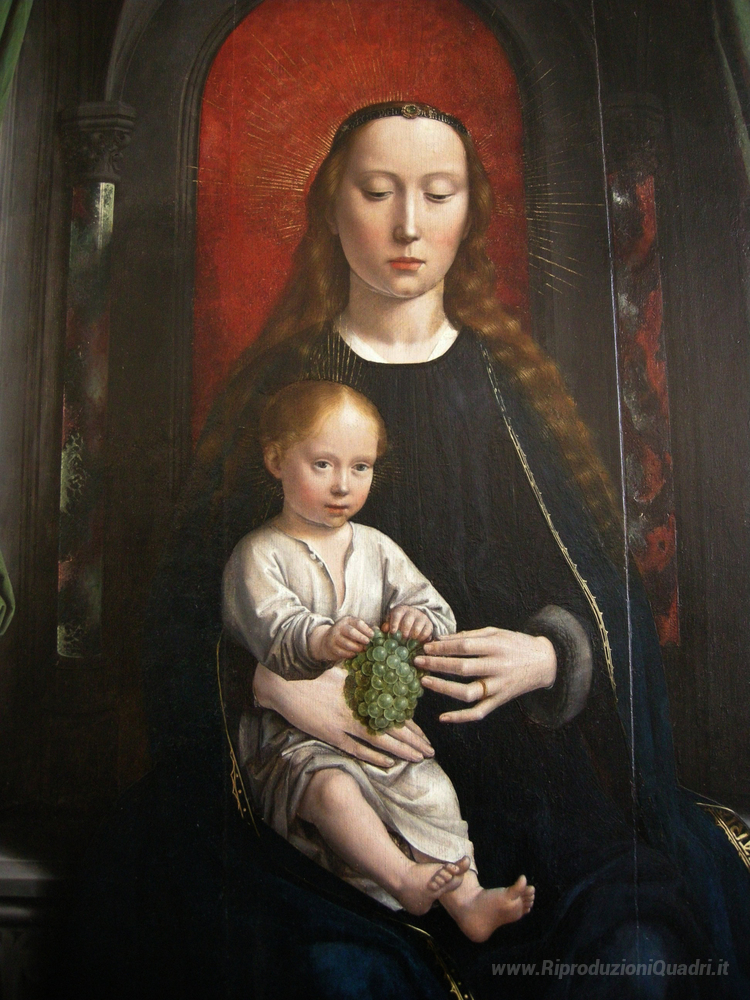 Ti offriamo una riproduzione artigianale su tela dell'opera famosa 'Polittico della Cervara: pannello centrale Madonna di Tarquinia' di Gerard David, dal Museo delle Riproduzioni.