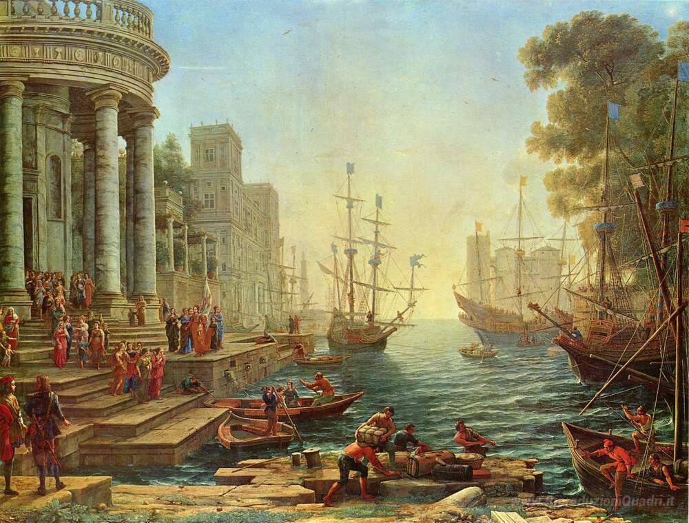 Ti offriamo una riproduzione artigianale su tela dell'opera famosa 'Porto con l'imbarco di Sant'Orsola' di Claude Lorrain, dal Museo delle Riproduzioni.