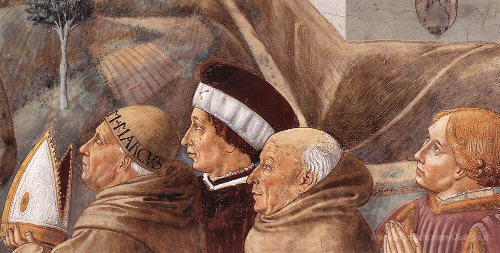 Ti offriamo una riproduzione artigianale su tela dell'opera famosa 'Predica agli uccelli e la Benedizione di Montefalco (particolare' di Benozzo Gozzoli, dal Museo delle Riproduzioni.