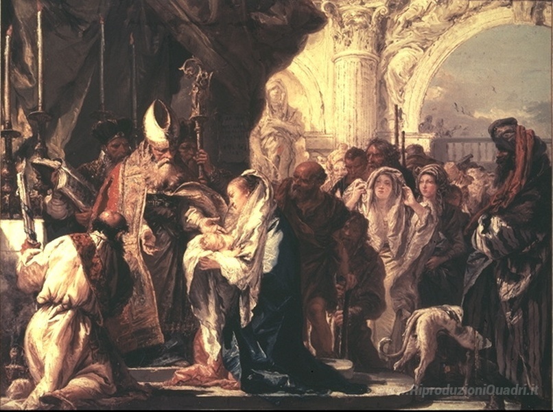 Ti offriamo una riproduzione artigianale su tela dell'opera famosa 'Presentazione al Tempio' di Giovanni Domenico Tiepolo, dal Museo delle Riproduzioni.