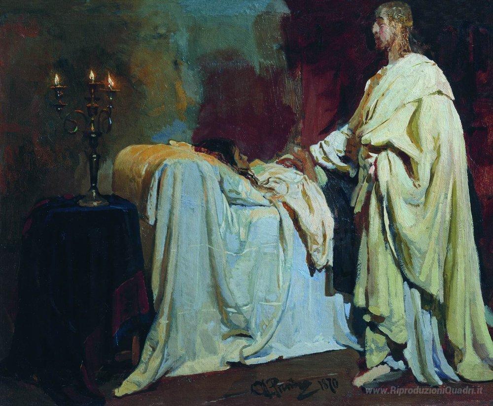 Ti offriamo una riproduzione artigianale su tela dell'opera famosa 'Raccolta di Giairo figlia' di Ilya Repin, dal Museo delle Riproduzioni.