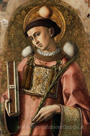 Ti offriamo una riproduzione artigianale su tela dell'opera famosa 'Raffigurazione di San Saintephen' di Carlo Crivelli, dal Museo delle Riproduzioni.