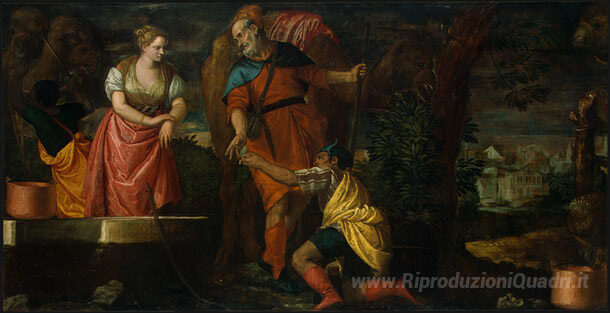 Ti offriamo una riproduzione artigianale su tela dell'opera famosa 'Rebecca al pozzo' di Paolo Veronese, dal Museo delle Riproduzioni.