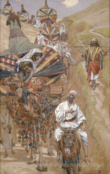 Ti offriamo una riproduzione artigianale su tela dell'opera famosa 'Rebecca incontra Isacco dal Cammino' di James Tissot, dal Museo delle Riproduzioni.