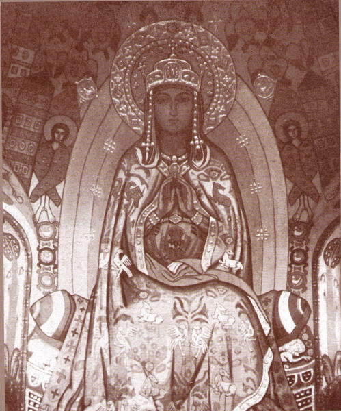 Ti offriamo una riproduzione artigianale su tela dell'opera famosa 'Regina del Cielo sopra il fiume della Vita' di Nicholas Roerich, dal Museo delle Riproduzioni.