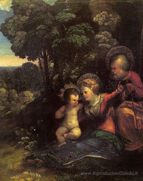 Ti offriamo una riproduzione artigianale su tela dell'opera famosa 'Riposo durante la fuga in Egitto' di Dosso Dossi, dal Museo delle Riproduzioni.