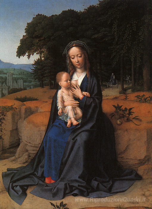 Ti offriamo una riproduzione artigianale su tela dell'opera famosa 'Riposo durante la fuga in Egitto' di Gerard David, dal Museo delle Riproduzioni.