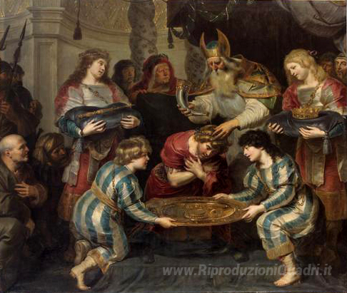 Ti offriamo una riproduzione artigianale su tela dell'opera famosa 'Salbung Salomos' di Cornelis de Vos, dal Museo delle Riproduzioni.