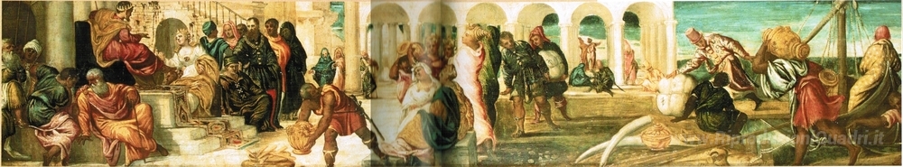 Ti offriamo una riproduzione artigianale su tela dell'opera famosa 'Salomone e la regina di Saba' di Tintoretto, dal Museo delle Riproduzioni.