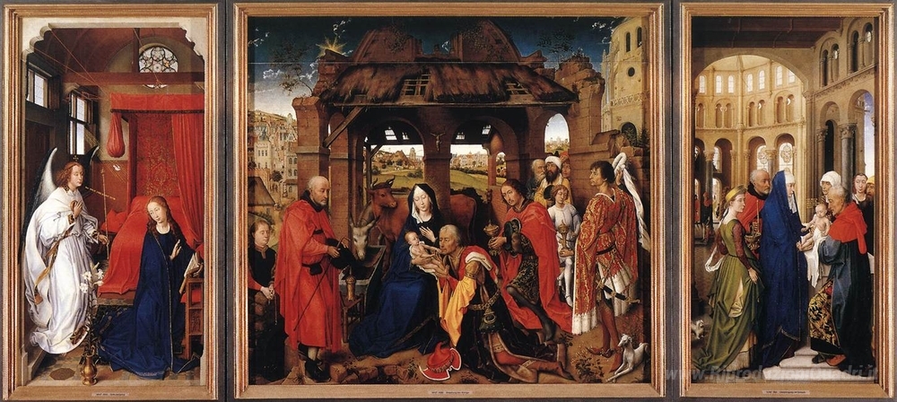 Ti offriamo una riproduzione artigianale su tela dell'opera famosa 'San Columba Pala' di Rogier van der Weyden, dal Museo delle Riproduzioni.